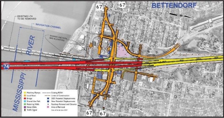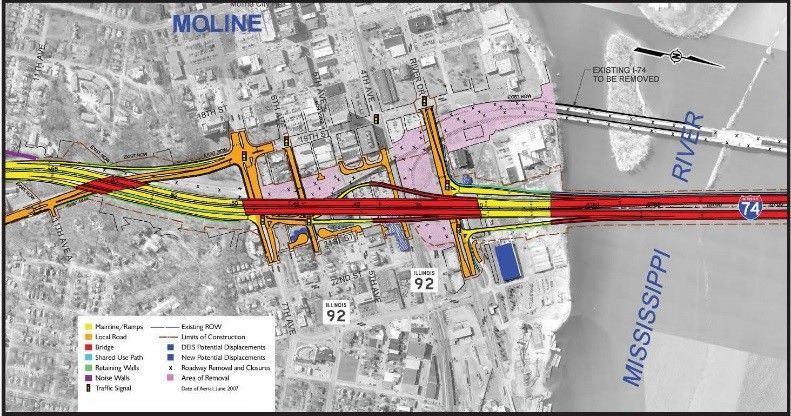 The I-74 Bridge Corridor project has been value engineered to reduce costs and the construction period from 8 to 3.5 years or less. Plans for the Iowa portion of the bridge are 100% complete and are nearing completion for the Illinois portion of the project, which will be completed this summer. Elements of the project including the Lincoln Road overpass and the interchange at 53rd Street have already been finished. Property purchases have been completed in Iowa, and all properties that required total buyouts are done in Illinois. Illinois DOT will be continuing with partial property buyouts over the next two years.