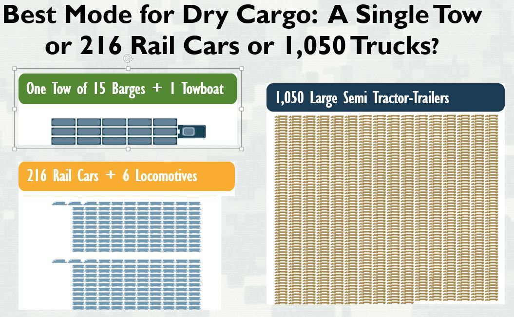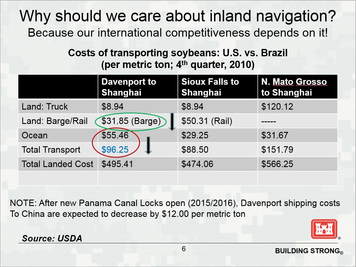 The Upper Mississippi River (UMR) carries more than 600 million tons of cargo each year. With the completion of improvements to the Panama Canal in 2016/17, opportunities may be present to increase river navigation and move more products. Barge transportation is the least expensive mode for bulk commodities and the most green transportation option. Mr. Heinhold cited the cost savings for industry as $23.74 per ton for traffic moving through the UMR.