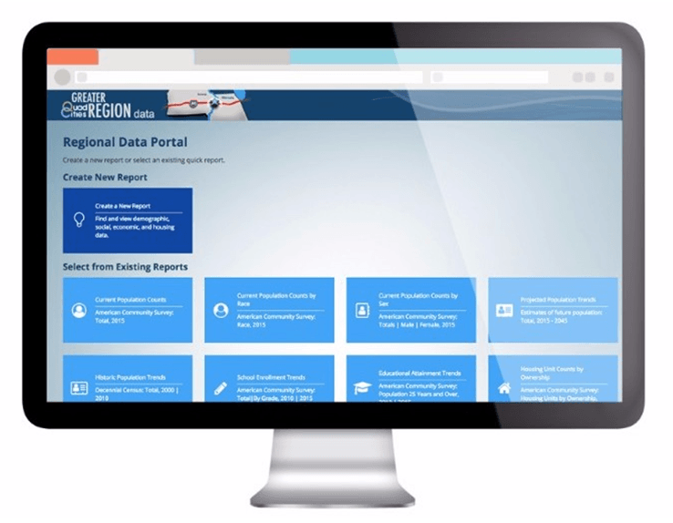 Please visit GreaterQCRegionData.org. For questions or to provide your ideas and feedback on the data portal, contact Lisa Miller, This email address is being protected from spambots. You need JavaScript enabled to view it., 309-793-6302, ext. 133 or Mike Saponaro, This email address is being protected from spambots. You need JavaScript enabled to view it., 309-793-6302, ext. 131.