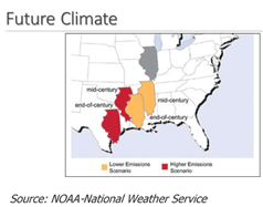 Future Climate and Strategies. Our future climate is predicted to be similar to the climate of our most southern states using lower emission and higher emission scenarios. The illustration below highlights this probability for mid-century to end-of-century forecasts for the State of Illinois. As an example of best practices, the NWS office in Davenport is powered by 40% renewable energy. Other national and local air emission reduction efforts will help to contribute to the slowing of climate trends. For more information on climate, refer to U.S. Global Change Research Program – National Climate Assessment at www.climate.gov.
