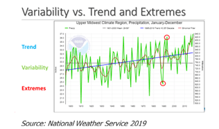 Climate vs. Weather. Climate is what you expect while weather is what you get. Weather records demonstrate variability and extremes, while climate is a trend over time. He illustrated this with a graph on annual precipitation for the upper Midwest with the precipitation trend increasing between 1900 and 2010 from 28 inches to 32 inches annually. This change represents an increase of 1/3 per inch over a decade, and has contributed to a 28% increase in flow of the Mississippi River. Understanding that climate change is occurring and the science behind these trends is critical for planning and preparedness as part of community resilience strategies.